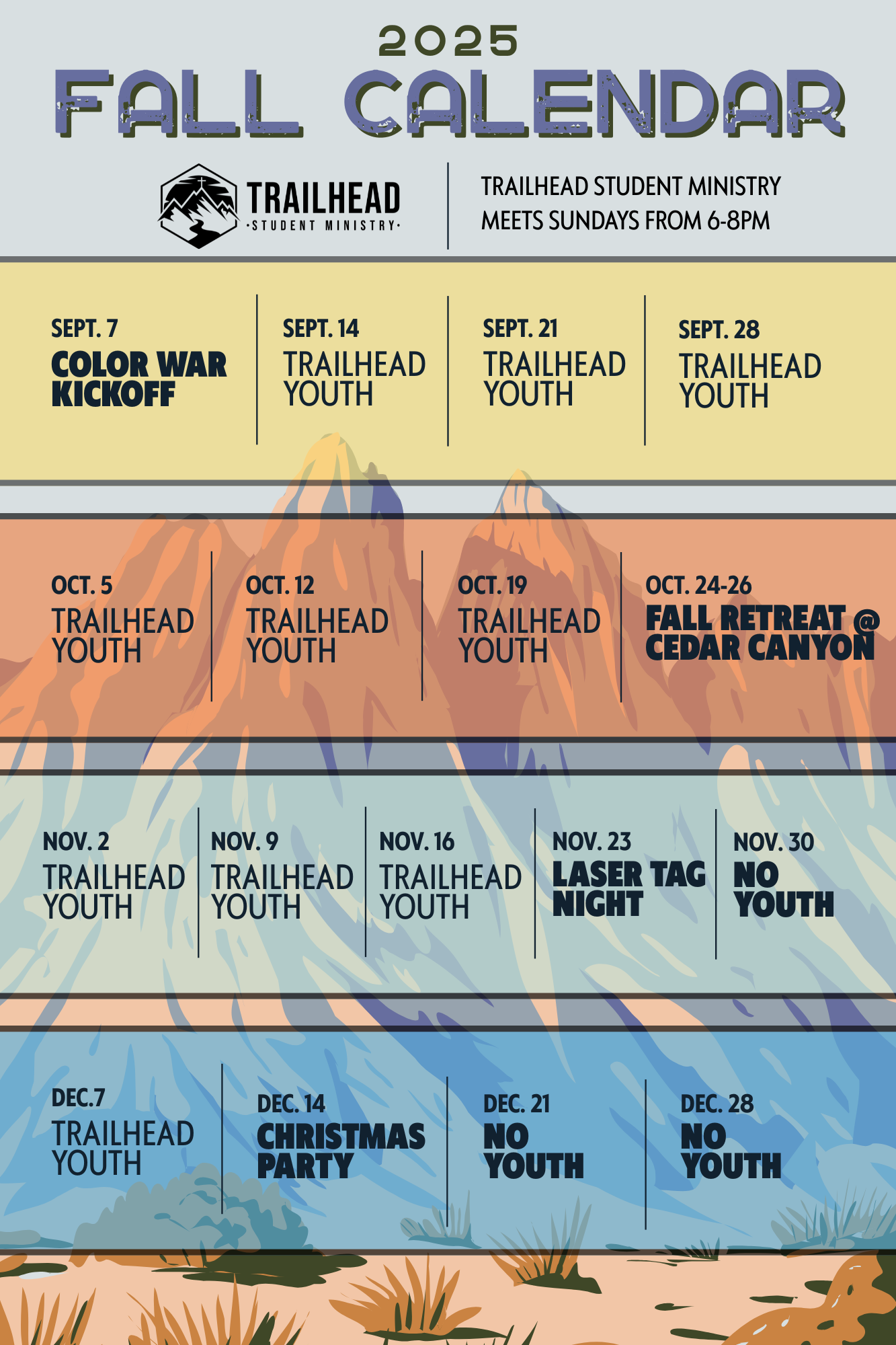 You'll experience a fun atmosphere where we play great games together, experience worship, spend time in small groups, and are challenged by an engaging message. The Trailhead is a great place to make friends and give you the Biblical tools to navigate life as a Christian in middle school or high school. We hope you can make it!
